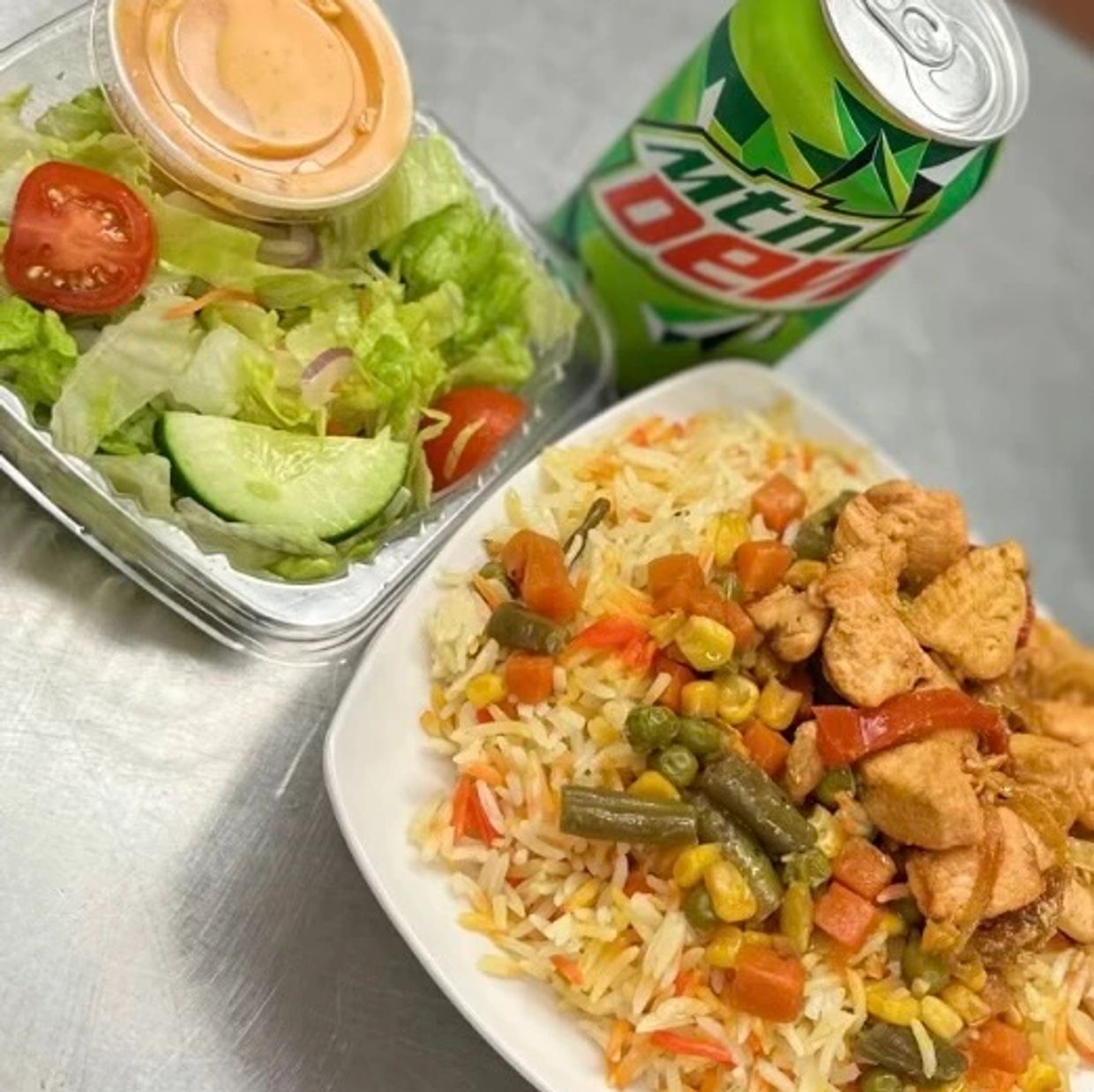 Rice and veggies with your Choice of steak, fried chicken, goat meat , tilapia or sauteed Chicken with a side salad and a drink.
